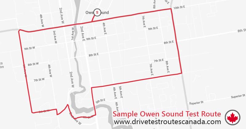 Disclaimer: This sample route is for demonstration purposes only and does not represent the actual test routes used during the test. Accurate Owen Sound driver test routes are available on our app.